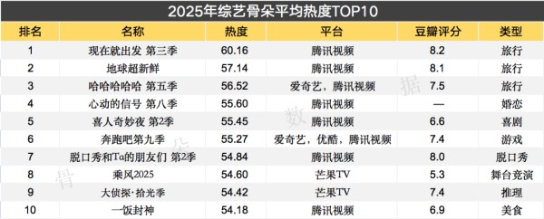 从热度来看,2025年骨朵平均热度前10中,综N代占据八成,可见这些成熟的综艺IP在流量上的稳定性。其中,《现在就出发 第三季》延续了前一季的高光表现,以骨朵平均热度59.06的成绩再次位列榜首;新综艺《地球超新鲜》和延续至第五季的《哈哈哈哈哈》分列二、三位,热度分别是57.14和56.52。