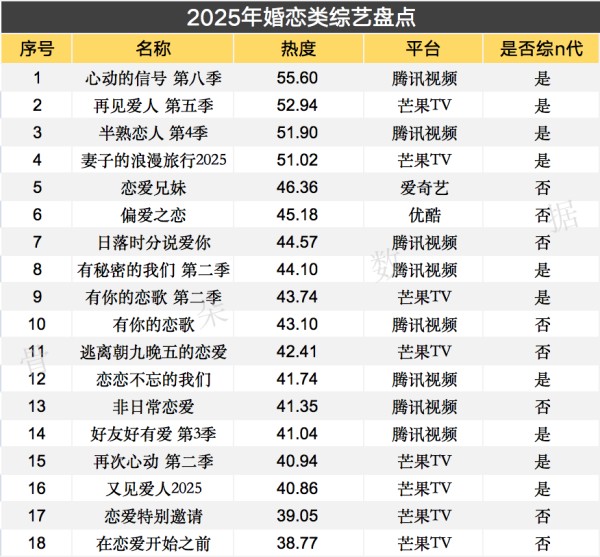 恋综曾作为现象级类型被各平台争相布局,2025年仍持续受到行业关注。全年共上线婚恋综艺18部,比去年增加了3部,其中10部为综N代。但从热度看,只有《心动的信号》系列凭借持续的CP效应保持稳定,热度名列前茅;而其余恋综,虽然各平台从不同视角进行了新尝试,但市场热度反馈普遍平淡,未能实现有效破圈。