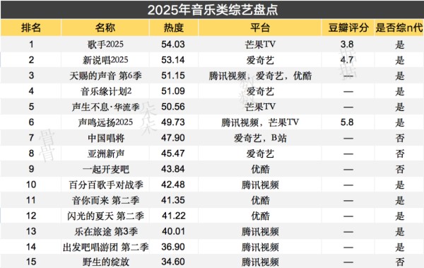 音乐综艺数量在2025年有了大幅度下降,全年仅14部,较上年的25部明显收窄。同时,音综里可供反复聆听的金曲减少,荐歌功能弱化。口碑也随之下滑。已开分的三部音综豆瓣评分普遍偏低,可见观众对内容的意见颇多。