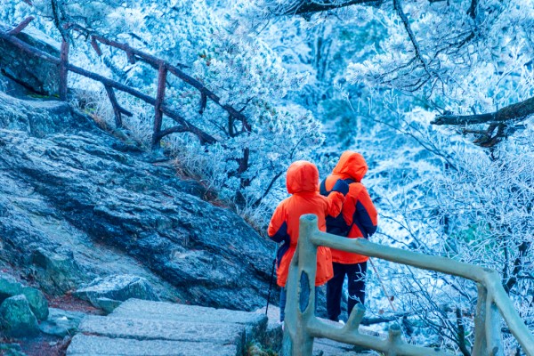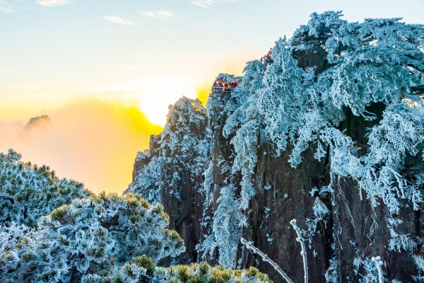 2025年11月18日清晨, 黄山迎来冬季首场雾凇、云海、日出“三景同框”盛景,不少游客提前登临观景台,沉醉于仙境之中。