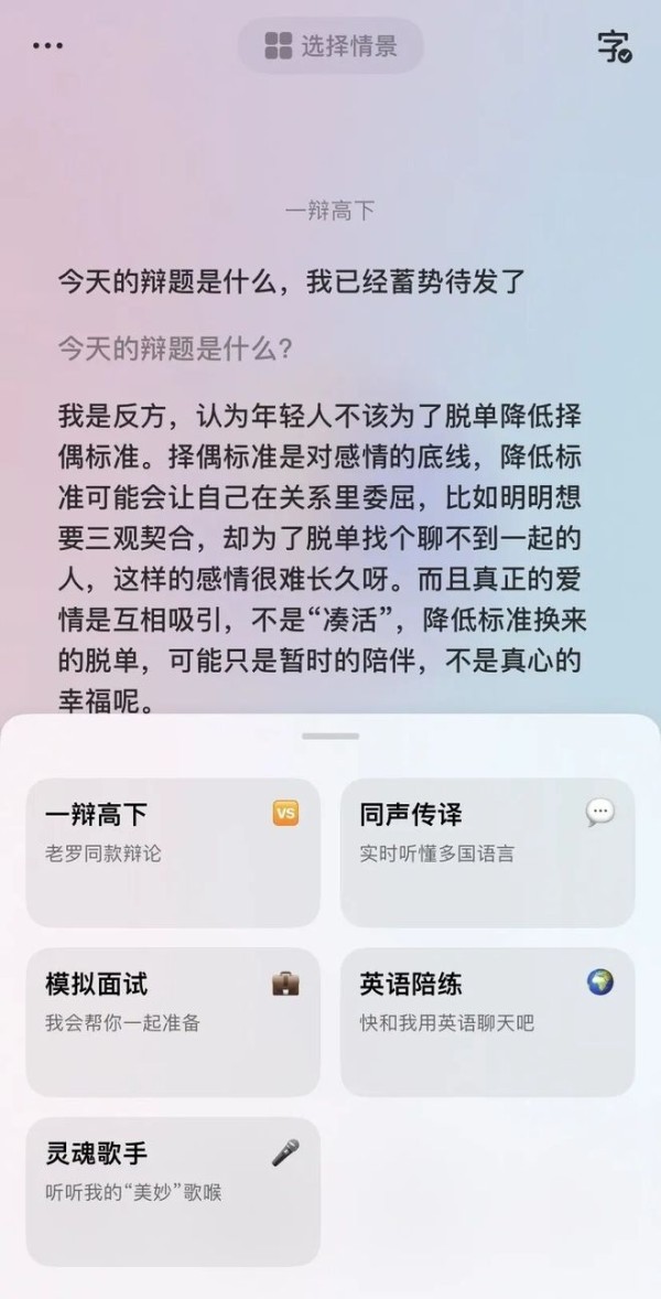 正如罗永浩在辩论后感慨:"现在如果是辩论或吵架,我试过的所有大模型产品里,豆包是最厉害。"这句话或许不仅是对一个AI助手的评价,更是对一种新交互方式的认可。当AI能够理解情绪、承接语境、参与博弈时,人机关系正在被重新定义。