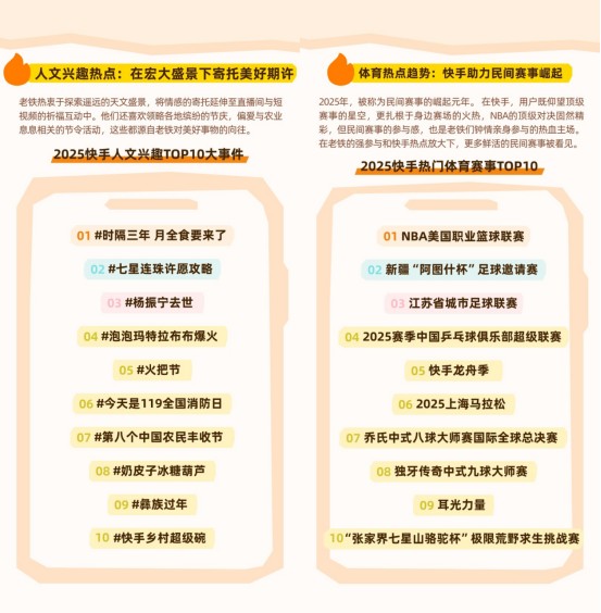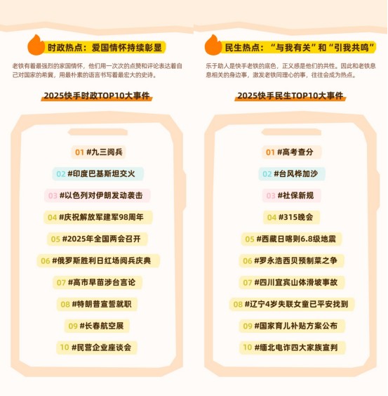 报告显示,快手用户既关注家国大事,也聚焦日常生活。他们对普通人的故事、节日热点、区域动态和民间赛事表现出强烈共鸣,形成了平台独特的情感基调。