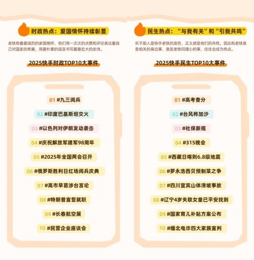 报告显示,快手用户既关注家国大事,也聚焦日常生活。他们对普通人的故事、节日热点、区域动态和民间赛事表现出强烈共鸣,形成了平台独特的情感基调。