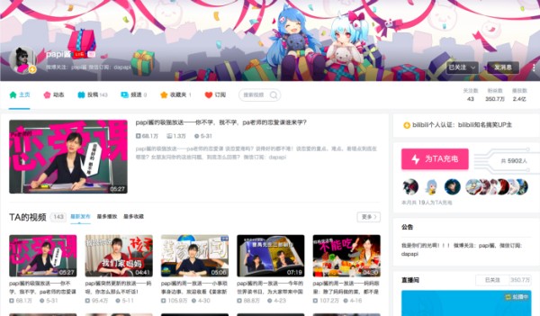 但papi酱真的过气了吗?从数据上来看,以年轻人最为活跃的视频播放平台哔哩哔哩(以下简称B站)为例,5月31日papi酱更新的视频《papi酱的吸猫放送——你不学,我不学,pa老师的恋爱课谁来学?》最高全站日排行第二名,前一段时间,《往年阻挠我过双十一的只有钱,今年不一样,还有脑子》、《papi酱的吐槽之——有些人一谈恋爱就招人讨厌》都体现了papi酱擅长的对于生活的观察和热点的跟进能力,在B站达到了200万、300万以上的播放量,而papi酱B站认证账号发布的视频累计播放量突破2.4亿。如果用行业中流行的说法,papi酱仍然是短视频领域的头部内容。