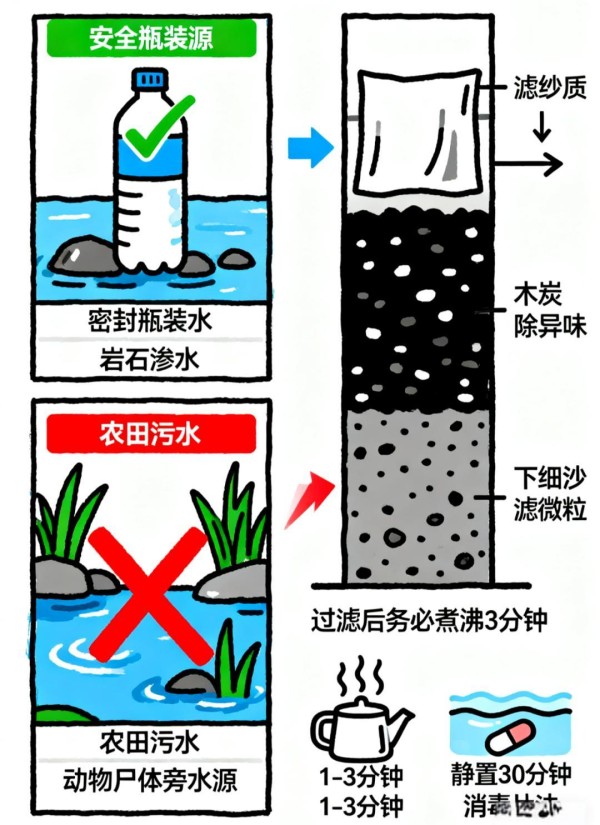 在灾难过后,水源往往容易受到污染,直接饮用未经处理的水可能面临霍乱、痢疾等严重疾病的威胁。因此,我们必须遵循“先寻水,后净化”的准则,以确保安全供水。具体来说,我们应该优先寻找那些安全可靠的水源,如密封完好的瓶装水、未开封的饮料,或者是室内储存的自来水(在未断水且无异味的情况下)以及在无辐射或化学污染的区域收集的雨水。在野外环境中,我们也可以寻找山谷溪流或岩石缝隙渗出的水,但必须注意避开农田下游和动物尸体附近的水源。种简易净化方法包括煮沸法、过滤法和应急片消毒。