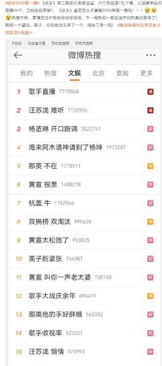 《歌手》的第二期节目播出后,观众们的热情如同火山爆发一般,六个热搜第一,七个爆点,这样的成绩简直让人难以置信。节目中的每一个细节,每一个音符,都成为了网友们热议的焦点。节目的表情包和热梗层出不穷,为观众们带来了无尽的欢乐。