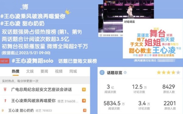 翻红的王心凌有多红呢?大家看一组数据就明白了,某博双话题强势占领热搜总榜第一和第九,两个话题合计阅读次数超过了3.5个亿,出五台播放量更是超过了2000万,这还只是截止到5月21号之前。