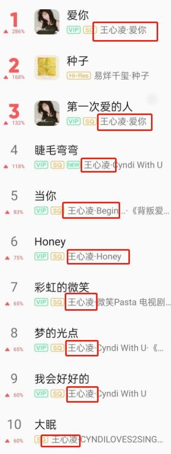 这还不是最牛的,某热门音乐榜单上,音乐飙升榜一栏,王心凌更是拿下了榜一和榜二到榜十的好成绩,如果不是因为中间还有易烊千玺的歌曲,王心凌可谓是完全拿下榜单的前十名。但就算只有九个,有如此好的名次和成绩,也完全可以用屠榜来表达了。