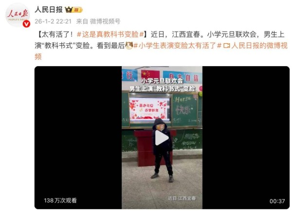 江西一小孩哥表演魔术走红,引起不少人的关注。视频显示,他用羽绒服大帽子作为遮挡道具,将语文、数学等课本作为“脸谱”,通过甩袖、转身、快速切换课本封面等动作进行“变脸”轮换,表演起来,动作干净利落,速度、肢体语言都相当到位,符合传统规范,一招一式非常娴熟,手速非常快,变脸堪称“神速”,只是很可惜最后一下变脸不小心“露了馅”,因转身失误导致怀中课本“哗啦”掉落。