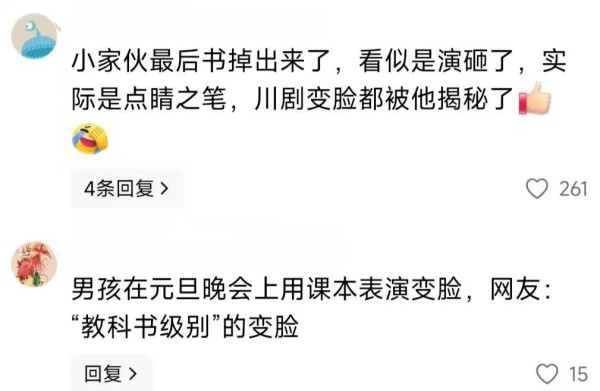 不过,这次失误却成为了表演的点睛之笔,更因结尾课本意外掉落露馅的戏剧性场面引爆全网热议,网友们看完他的魔术表演纷纷点赞,有网友表示:这是真教科书变脸,有网友表示:这节目好,变脸+小品二合一,还有网友表示:小家伙最后书掉出来了,看似是演砸了,实际是点睛之笔,川剧变脸都被他揭秘了。