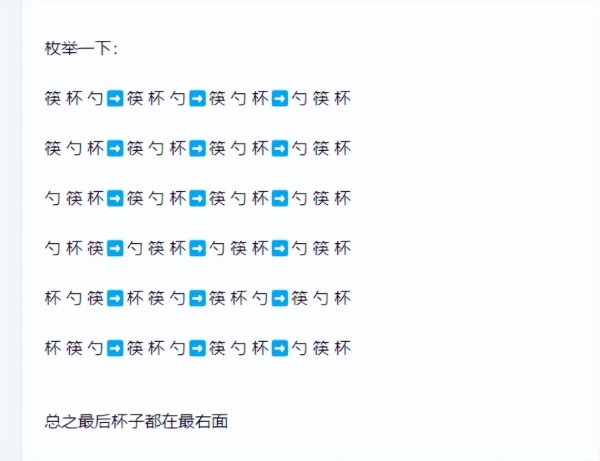 这样勺子、筷子和杯子按照他预设的方式排列。而左手持勺子或者筷子,右手永远持杯子,小尼是怎么也不会错了。说到底,排列组合的方式只有六种,也很容易通过遍历的方法来验证这个魔术的原理。