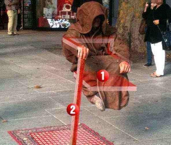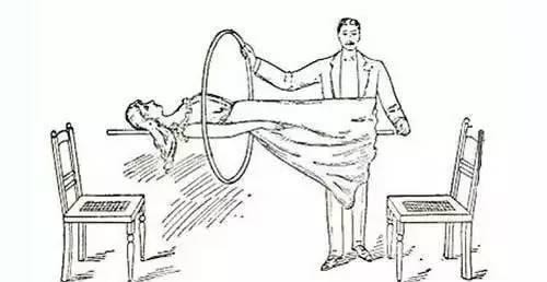 3.人体悬浮术式,其实是魔术师的助手躺在了一个由木棍支撑的平台上,魔术师用脚挡住了那个从地面到助手支撑的那个木棍,很多魔术师脚下踩的就是这个支架的上升和下降开关。