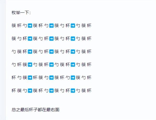 第三步,刘谦让勺子跟它左边的东西互换位置。如果勺子已经在最左边,同样不需要移动。然后结合了第一步的结果,使得左位和中位一定是勺子和筷子,只是位置不定。但是,由于前两步的限定,右位一定留给了杯子。