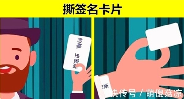 撕签名卡片,是一种近景表演魔术,找一张看片让观众签上名字,然后将卡片撕碎,最后居然将签完名的卡片,完好的呈现出来,看着的确很神奇,但是这肯定是假的,背后隐藏的秘密就是魔术师袖子,他在观众签完名之后,迅速将卡片放入袖口里,接着马上把另一张备用的卡片换到手上将其撕碎,最后再把那张签名的卡片从袖口变出来,这就是整个的魔术过程,其实并不是很难。