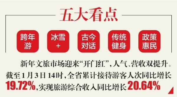 2026年元旦假期,我省全面推进文旅体商深度融合,市场安全有序、供需两旺。“跨年游”“冰雪+”“古今对话”“传统健身”“政策惠民”,五大看点红红火火迎来“十五五”首年“开门红”。截至1月3日14时,全省累计接待游客人次同比增长19.72%,实现旅游综合收入同比增长20.64%。其中,全省9家一级博物馆累计接待观众23.77万人次,同比增长117.06%。