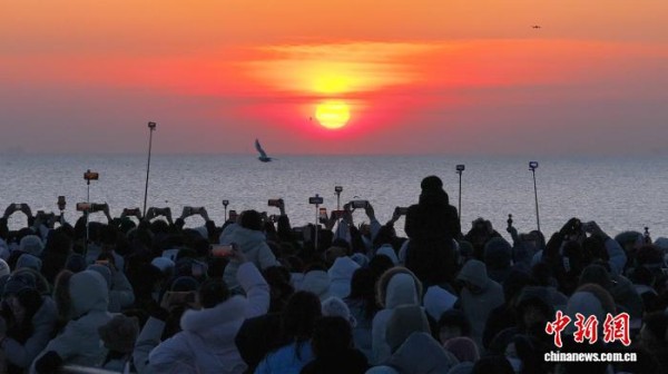 元旦假期,游客在天津观看日出。(天津东疆综保区供图)