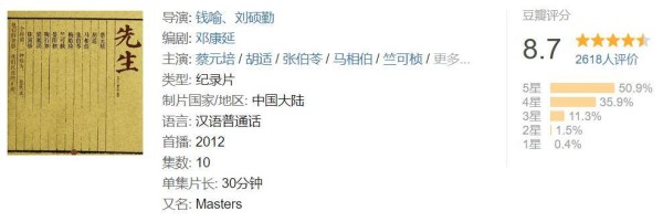 这些大师来自不同的领域,如科学、文学、艺术、教育等,他们的事迹和精神风貌在纪录片中得到了生动的呈现。