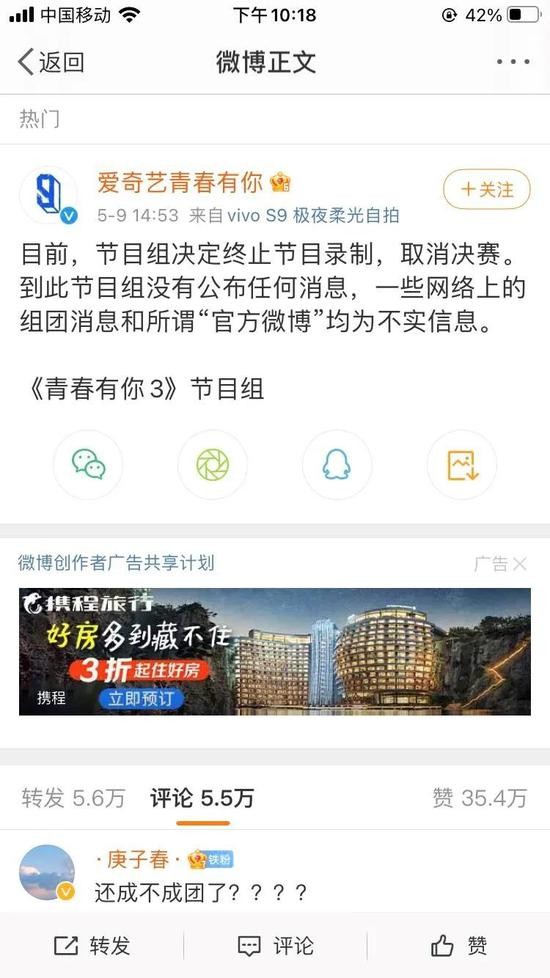 5月9日,爱奇艺《青春有你3》节目组决定终止节目录制,取消决赛。粉丝们花费大量的时间、精力、金钱换来的榜单名次,转瞬成空。