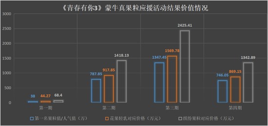 据真果粒青春福粒社数据,《青春有你3》已经进行了4期应援活动,仅仅是第一名,就分别获得38万、788万、1348万和746万的果粒值(人气值)。按照花果轻乳系列售价计算,4期应援活动的果粒值总价累计达到3400万元;而按照缤纷果粒高端系列售价计算,该数据高达5254.8万元。