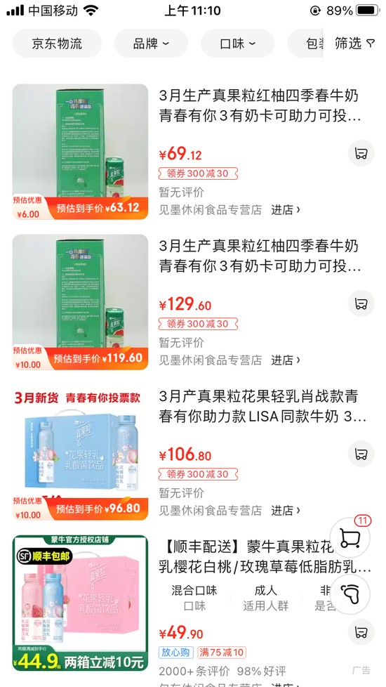 《商学院》记者发现,在主流电商平台上,甚至直接有《青春有你3》可以助力的“奶卡”出售。原本这样的卡片只需要54元购买一箱缤纷果粒高端系列产品即可获得,但分开售卖的卡片价格甚至达到129元一张。