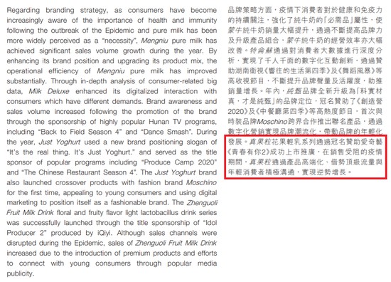 蒙牛2020年财报明确指出,“真果粒花果轻乳系列通过冠名赞助爱奇艺《青春有你2》成功上市推广,在销售受阻的疫情期间,真果粒通过产品高端化、借势顶级流量与年轻消费者积极沟通,实现逆势增长。”