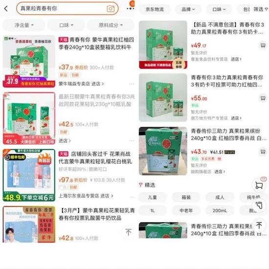 《商学院》记者也注意到,目前蒙牛线上官方旗舰店均已下架《青春有你》活动指定产品,但在淘宝、京东等各大商城仍有自称为活动指定产品的商品在售卖,且出售价格大多低于官方售价。