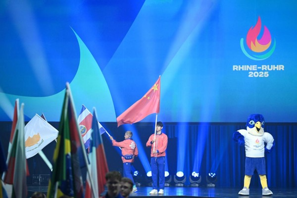 7月27日,中国代表团旗帜在闭幕式上入场。新华社记者 连漪 摄 本届大运会不少代表团派出奥运级别的运动员。东道主德国共派出11名运动员参加跳水比赛,其中5名选手是参加过奥运会的选手,而莱娜·亨策尔更是在东京奥运会上获得过铜牌。日本代表团则派出了以巴黎奥运会三金得主冈慎之助领衔的体操队阵容。泰国代表团也有班隆·杜丁当这样的杭州亚运会跆拳道冠军选手。