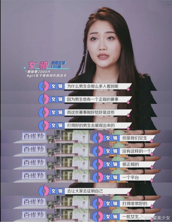 女骑谈到目前游戏圈缺少女性正规赛事,女玩家没有一个公平的展示实力的平台。