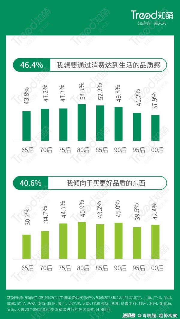 对于物质水平的要求让消费者内心深处有着坚不可摧的安全感,一直以来人们对生活品质的标准和期待从不懈怠。“品质”升级的今天,人们致力于寻求更加高效、专业的产品来解决生活中细小的痛点,提升效率的同时兼顾品质。知萌2024年中国消费趋势调研中发现,消费者想要通过消费来达到生活的品质感、倾向于购买更好品质的东西,尤其80、85和90后人群。