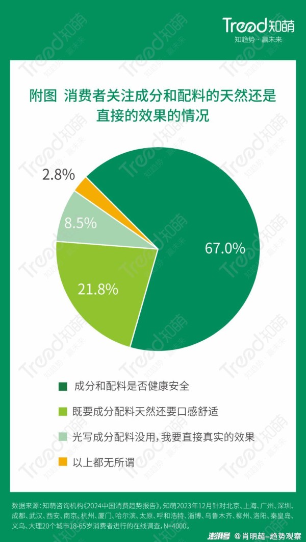 在食品的各个领域,都有很多消费者会特别关注配料表与成分表,尤其包装食品饮料、乳制品、健康滋补品等。在成分上,67.0%的消费者想要成分健康,但也有一部分消费者不只要健康,还要口感、要看得见的效果。