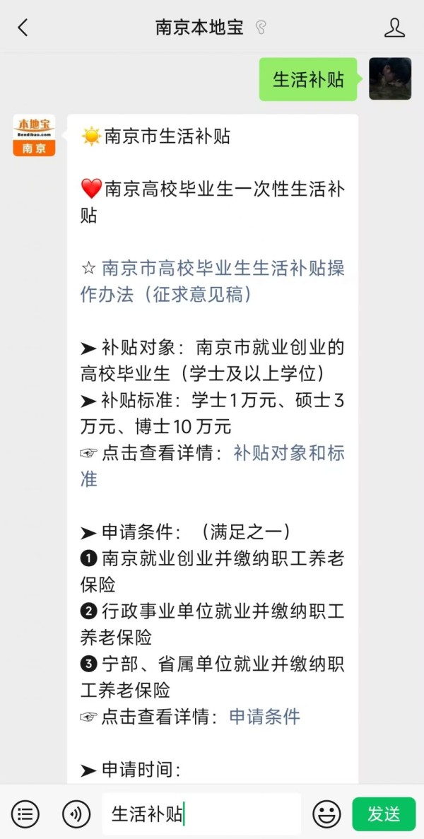 温馨提示:微信搜索公众号【南京本地宝】,关注后在对话框回复【生活补贴】可获南京高校毕业生一次性生活补贴申请指南,查询一次性生活补贴申请入口、申请时间、申请条件、补贴标准、补贴对象、补贴流程等信息。