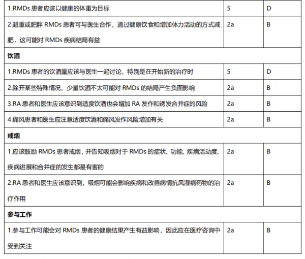 戒烟:应鼓励RMDs患者积极戒烟,吸烟对所有RMDs的症状、功能、疾病活动、疾病进展和并发症的发生均不利,且吸烟会影响改善病情抗风湿病药物的治疗作用