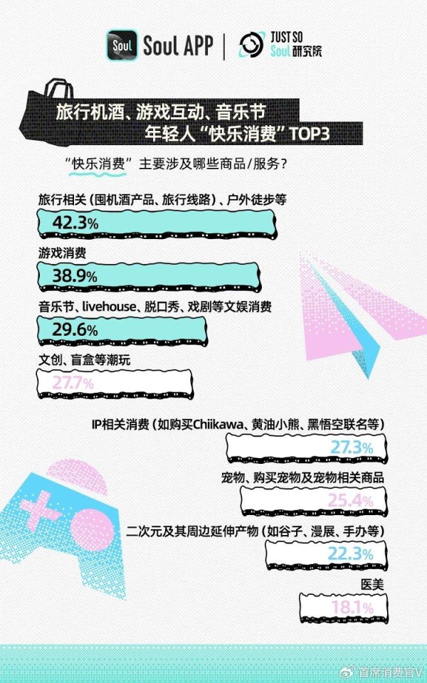 这也就不难理解为什么陪伴型玩偶Jellycat、各地花样百出的文创会风靡年轻群体。在今年为“快乐消费”的支出中,旅行相关如囤机酒产品、旅行线路(42.3%)、游戏消费(38.9%)、音乐节/脱口秀等文娱消费(29.6%)、文创/盲盒等潮玩(27.7%)和IP相关消费如购买Chiikawa、黄油小熊联名商品(27.3%)等是主要类型。