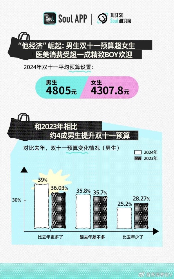 根据Just So Soul此次调研,情况似乎发生了改变。报告显示,2024年,男生双十一消费预算超过女性,前者为4805元,后者为4307.8元。