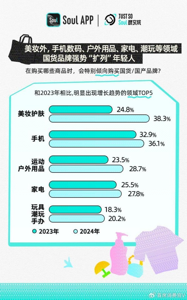 在品牌倾向上,2024年,有近六成年轻人选择购买国货。尤其是在美妆护肤、手机、运动/户外用品、家电、玩具/潮玩/手办上,年轻人对国货品牌的喜爱度进一步提升——这也是和2023年相比明显出现增长趋势的领域TOP5。