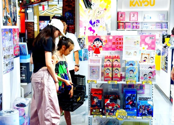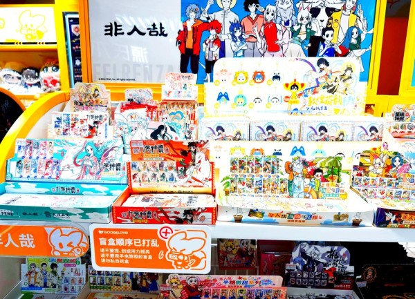 紧邻“捏捏乐”玩具店,记者又探访了“Goodlove古乐屋”和“卡游”两家店铺,这里又是另一番情绪消费的景象。盲盒凭借其独特的“未知惊喜”特性,持续激发着消费者的收集欲望和社交热情,玩家们在线上交流群中找寻共鸣,互换盲盒以分享快乐。而漫画、游戏衍生周边产品,如海报、徽章、透卡等“谷子”,则深深寄托着年轻人对虚拟角色的情感与热爱。一位店长李女士坦言:“收藏‘谷子’,就像守护一份热爱。”这恰恰道出了其热销的秘诀。
