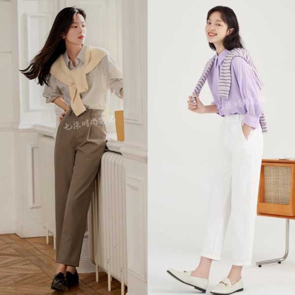 也可以试试搭白裤子,能化解衬衫的严肃感,还能顺带提升穿搭质感。穿衬衫也可以在肩上搭一件针织衫,看起来慵懒优雅,又能打破基础款穿搭的单调。