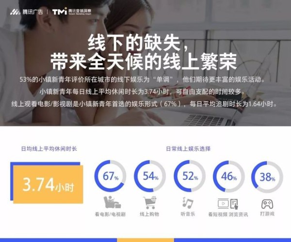 从受众来看,对娱乐内容的消费也可大致分为四类:下沉市场的小镇青年、独具个性的Z世代(95后、00后)、不再与消费绝缘的银发一族,以及千禧一代(80后、90后),这也是一般被业界视为四类不可忽视的消费潜力人群。 千禧一代由于阅历丰富,Z世代由于年轻与网生,对一般性的娱乐内容已经不再敏感,所以直观来看,这些年在内容消费上获益最大的,就数小镇青年与银发一族。 先说小镇青年,根据快手大数据研究院联合《中国青年报》、红杉中国与神策数据推出的《2019小镇青年报告》,里面就提出了几个刷新认知的硬核数据: 比如小镇青年观看“学习型视频”占比是城市青年的8倍;73%的人喜欢存钱和省钱;37%的小镇青年有除工资以外的赚钱渠道…… 精神趋于平等,是内容消费的第一个关键词。 腾讯广告TMI腾讯营销洞察,也在岁末发布的研究报告《正在消失的壁垒——腾讯2019小镇新青年研究报告》中提到,小镇新青年的消费表现出“高线趋同化、圈层精细化、娱乐极致化”的趋势。