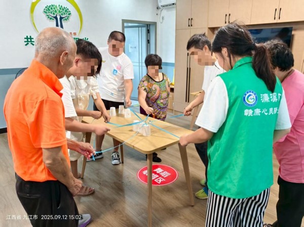图为全国精康融合行动试点县濂溪区赣康心灵驿站社工组织服务对象进行康复训练