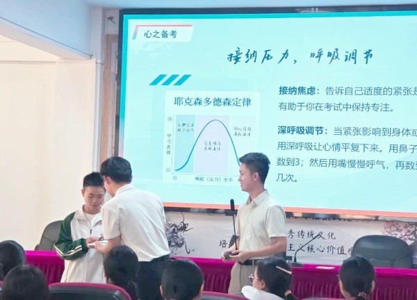 针对考前紧张情绪,万镇瑞导师提出了一项实用的建议:在日常学习中进行心态训练,把平时的模拟考试当作正式考试来对待,从而逐步提升心理素质。他提倡学生们建立“战略上藐视考试,战术上重视考试”的心态,以平和的心态去面对每一次考试。在提升道法知识和英语单词背诵记忆方面,梁恩智副校长分享了若干有效技巧。例如,利用零碎时间进行反复记忆,结合艾宾浩斯记忆曲线合理安排复习频率。他还建议学生们根据个人学习习惯制作记忆卡片,以便随时随地进行复习。