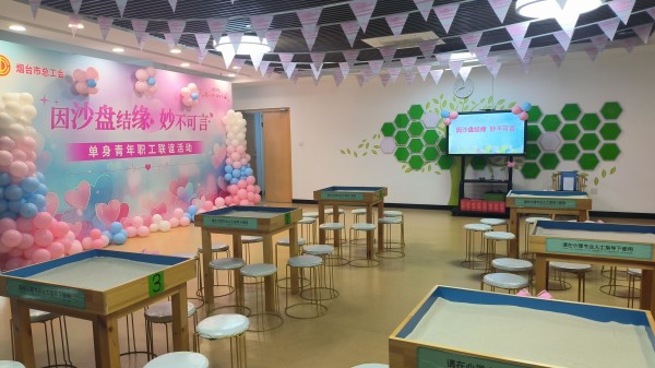 如何让相亲变得轻松自然?烟台市总工会自主研发推出“因沙盘结缘 妙不可言”单身青年职工联谊活动(沙盘相亲活动)采用沙盘游戏+趣味游戏相结合的形式,从心理学角度精心设计游戏主题,将“缘分天注定,幸福靠自己”的交友理念贯穿于整场活动中,引导单身青年积极表达和展示自我,激发交友主动性,提高交友成功率。这种创新模式在互动共创中有效提升职工牵手率,在已举办的8场沙盘活动中,单场最高牵手成功率高达45%,受到青年职工的广泛欢迎。