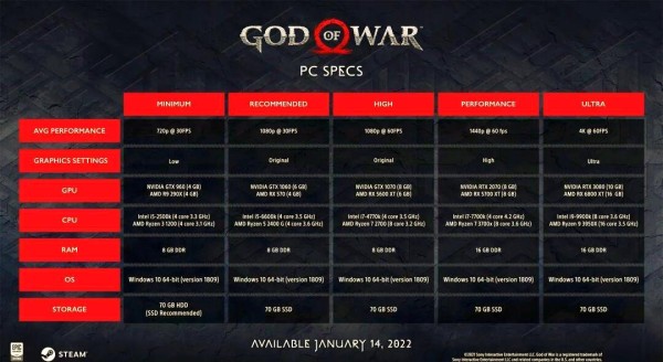 今日,《战神4》PC版发布了引人注目的全新预告片,同时,游戏的配置需求信息也已提前揭晓。《战神4》PC版的配置需求根据画面表现分为五个档次。若要在1080p分辨率下以60帧每秒的速度流畅运行游戏,推荐使用i7-4770k处理器,配备8GB内存,并搭载GTX 1070(8G)显卡。值得注意的是,Steam平台上玩家普遍使用的GTX 1066显卡在1080p画面下仅能达到30FPS,可能无法满足高帧率的需求。