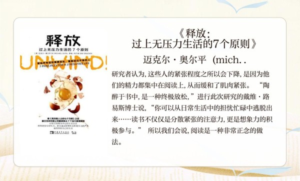 阅读是一种非常有效的放松方式。《释放:过上无压力生活的7个原则》书中指出,阅读可以帮助人们从日常生活中的担忧和忙碌中逃脱出来,进入一种放松的状态。不同的阅读类型会产生不同的效果。例如,阅读流行小说可以让人不需要耗费太多脑力,是一种公认的放松方式。而阅读文学经典著作则需要调动和投入意识,它们通常会提出一些问题,帮助人们寻找人生的意义,从而减少生活中的压力。