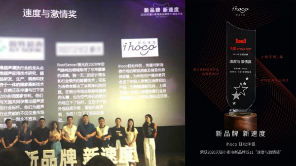 (ihoco轻松伴侣荣获2020天猫小家电新品牌双十一“速度与激情奖” )