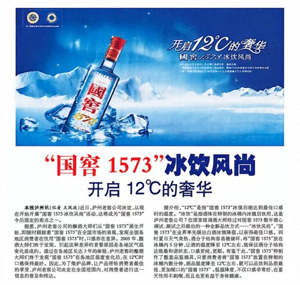 2009年9月14日,《四川经济日报》刊发《“国窖1573”冰饮风尚开启12℃的奢华》