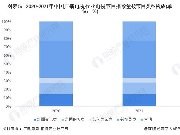 图表5:2020-2021年中国广播电视行业电视节目播放量按节目类型构成