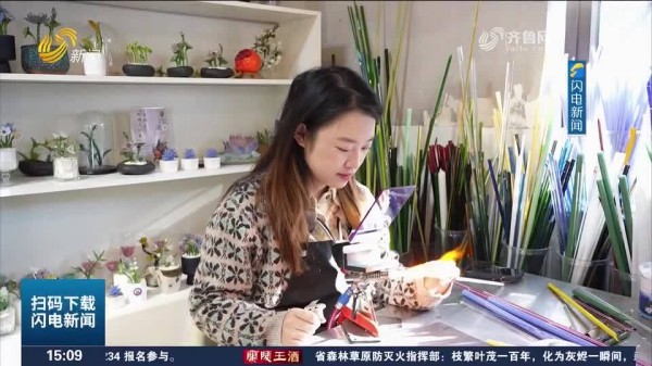 在淄博博山颜神古镇Light White创意玻璃手作的烧琉璃体验区,游客于欢正手持炽热的琉璃料,在1400℃的灯工火焰上制作一枚精致的树叶。这种沉浸式的手作体验,吸引了大批游客前来打卡。游客于欢说:“第一次做这个琉璃灯工,感受还是不错的,这次做的是一片叶子,体验感非常好,做出来之后很有成就感。”