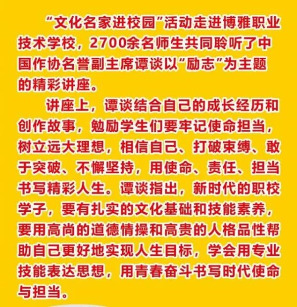 就在昨天,著名作家谭谈先生在博雅学校作了一场精彩的励志演讲。聆听完他的演讲,我感触良多,心潮澎湃: