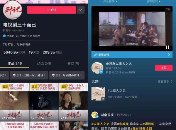 如今,基于短视频行业的高速发展,抖音快手早已成为内容方不容忽视的宣传阵地,比如最近的热播影视节目《以家人之名》、《八佰》、《三十而已》等官方账号接连入驻抖音,并在平台进行一系列的精心策划吸引增量用户。