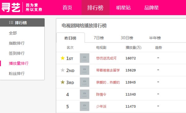 近日,根据“寻艺”网数据显示,在进入2019年7月份,当前热播电视剧网播量如下:《悲伤逆流成河》以日播量1.6亿稳居榜首;《带着爸爸去留学》以日播量1.5亿紧随其后;《亲爱的,热爱的》以日播量1.3亿挤进前三;而已经完结已有近十天之久的《少年派》依旧热度不减,强势力压多部热播新剧,以日播量1.1亿挤进前五。下面,笔者就榜单中五部电视剧给大家做个简单点评和分析,看看你是否都在追剧。